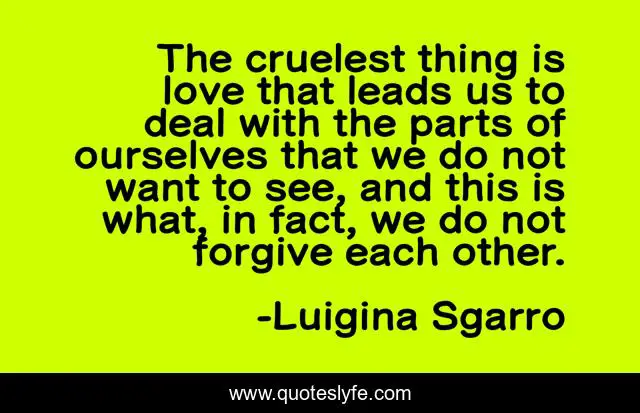 This page presents the quote "The cruelest thing is love that leads us to deal with the parts of ourselves that we do not want to see, and this is what, in fact, we do not forgive each other.". Author of this quote is Luigina Sgarro. This quote is about relationships, love, affection,.