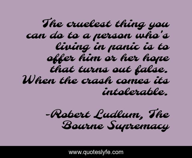 This page presents the quote "The cruelest thing you can do to a person who's living in panic is to offer him or her hope that turns out false. When the crash comes its intolerable.". Author of this quote is Robert Ludlum, The Bourne Supremacy. This quote is about pain, panic, hope, hurt,.