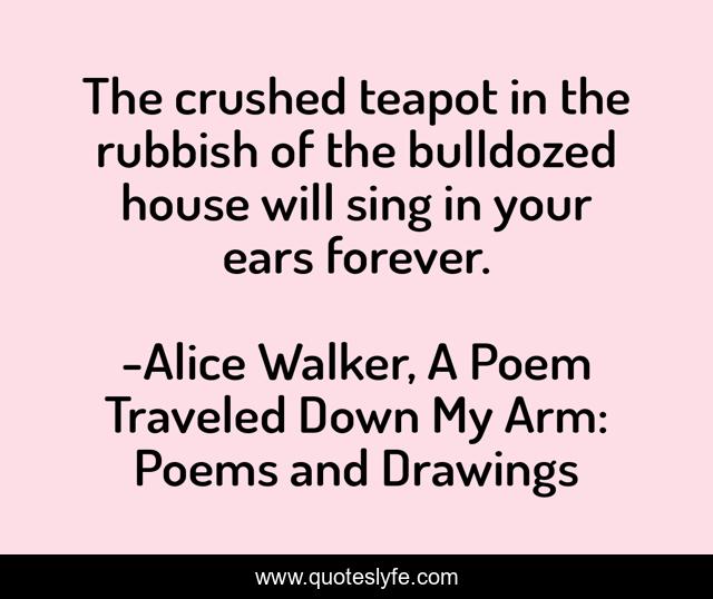 This page presents the quote "The crushed teapot in the rubbish of the bulldozed house will sing in your ears forever.". Author of this quote is Alice Walker, A Poem Traveled Down My Arm: Poems and Drawings. .