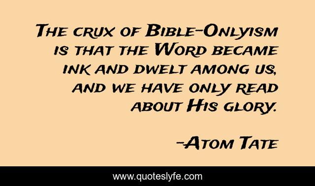 This page presents the quote "The crux of Bible-Onlyism is that the Word became ink and dwelt among us, and we have only read about His glory.". Author of this quote is Atom Tate. This quote is about bible-only, sola-scriptura, reformed-theology, christianity,.