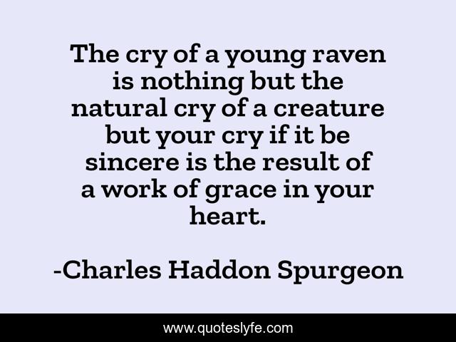 This page presents the quote "The cry of a young raven is nothing but the natural cry of a creature but your cry if it be sincere is the result of a work of grace in your heart.". Author of this quote is Charles Haddon Spurgeon. .