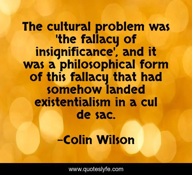 This page presents the quote "The cultural problem was 'the fallacy of insignificance', and it was a philosophical form of this fallacy that had somehow landed existentialism in a cul de sac.". Author of this quote is Colin Wilson. This quote is about colin-wilson, existentialism,.