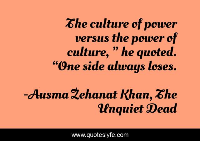 This page presents the quote "The culture of power versus the power of culture, ” he quoted. “One side always loses.". Author of this quote is Ausma Zehanat Khan, The Unquiet Dead. This quote is about culture, culture-wars, power,.