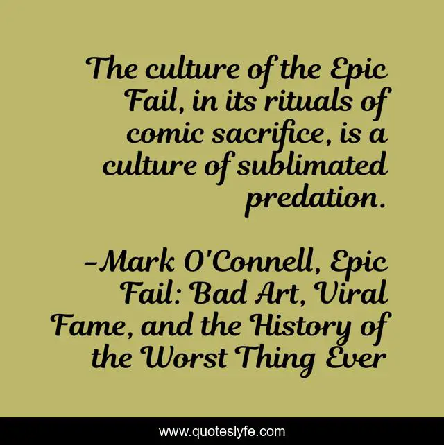 This page presents the quote "The culture of the Epic Fail, in its rituals of comic sacrifice, is a culture of sublimated predation.". Author of this quote is Mark O'Connell, Epic Fail: Bad Art, Viral Fame, and the History of the Worst Thing Ever. This quote is about witty, internet,.