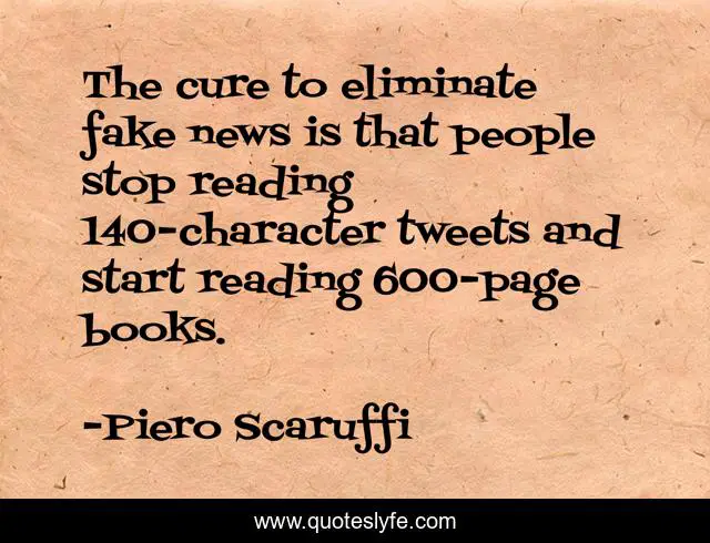 This page presents the quote "The cure to eliminate fake news is that people stop reading 140-character tweets and start reading 600-page books.". Author of this quote is Piero Scaruffi. This quote is about social-media, education, tweet, bookworm, fake-news, books, learning, reading, twitter,.