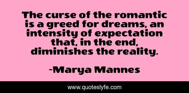 This page presents the quote "The curse of the romantic is a greed for dreams, an intensity of expectation that, in the end, diminishes the reality.". Author of this quote is Marya Mannes. This quote is about romantic, greed, reality,.