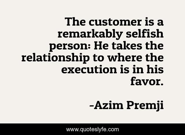 This page presents the quote "The customer is a remarkably selfish person: He takes the relationship to where the execution is in his favor.". Author of this quote is Azim Premji. This quote is about customer, selfish, execution,.