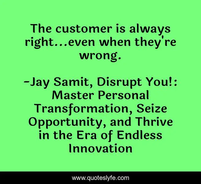 "Jay Samit, Disrupt You!: Master Personal Transformation, Seize Opportunity, and Thrive in the Era of Endless Innovation Quotes." Quoteslyfe.com, 2025. Fri. 05 Dec. 2025. <https://www.quoteslyfe.com/quote/The-customer-is-always-right-even-when-106484>.