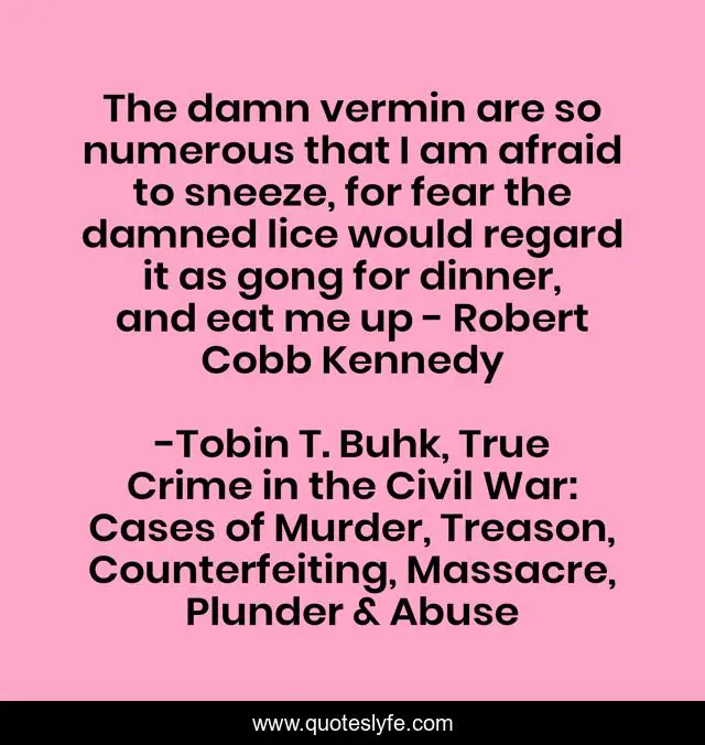 This page presents the quote "The damn vermin are so numerous that I am afraid to sneeze, for fear the damned lice would regard it as gong for dinner, and eat me up - Robert Cobb Kennedy". Author of this quote is Tobin T. Buhk, True Crime in the Civil War: Cases of Murder, Treason, Counterfeiting, Massacre, Plunder & Abuse. This quote is about prisoner, parasites, lice, civil-war, prison,.