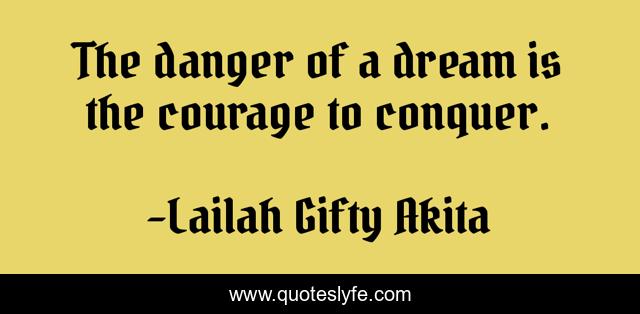 This page presents the quote "The danger of a dream is the courage to conquer.". Author of this quote is Lailah Gifty Akita. This quote is about dont-quit, courage, lailah-gifty-akita-affirmations, dreams, danger,.