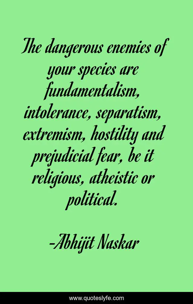 The dangerous enemies of your species are fundamentalism, intolerance, separatism, extremism, hostility and prejudicial fear, be it religious, atheistic or political.