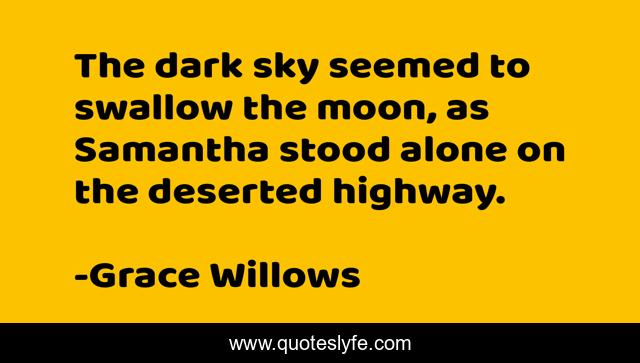 This page presents the quote "The dark sky seemed to swallow the moon, as Samantha stood alone on the deserted highway.". Author of this quote is Grace Willows. This quote is about desire, mystery, stalked, love, arson, scary, fire, pyromania, romance,.