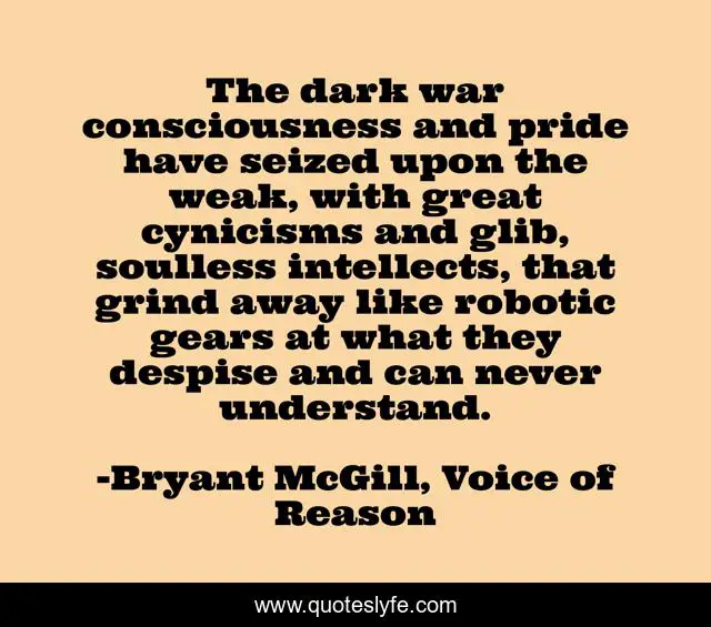 This page presents the quote "The dark war consciousness and pride have seized upon the weak, with great cynicisms and glib, soulless intellects, that grind away like robotic gears at what they despise and can never understand.". Author of this quote is Bryant McGill, Voice of Reason. This quote is about pride, understand, conscoiusness, cynicism,.