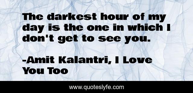This page presents the quote "The darkest hour of my day is the one in which I don't get to see you.". Author of this quote is Amit Kalantri, I Love You Too. This quote is about beautiful, flirty, lovers, love, amit-kalantri-writer, beauty, amit-kalantri, pick-up-lines, love-sayings,.