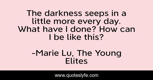 This page presents the quote "The darkness seeps in a little more every day. What have I done? How can I be like this?". Author of this quote is Marie Lu, The Young Elites. .