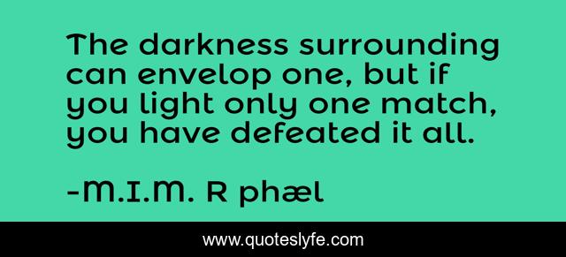 This page presents the quote "The darkness surrounding can envelop one, but if you light only one match, you have defeated it all.". Author of this quote is M.I.M. Răphæl. This quote is about light, inspired, darkness, metaphoric,.