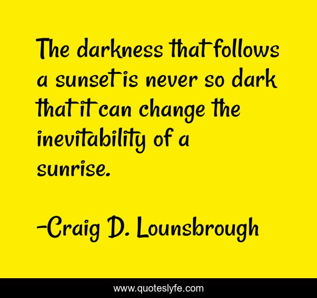 This page presents the quote "The darkness that follows a sunset is never so dark that it can change the inevitability of a sunrise.". Author of this quote is Craig D. Lounsbrough. This quote is about faith, darkness, light, hopeful, possibilities, sunset, hope, god, new,.