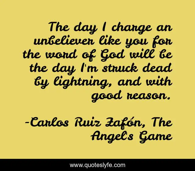 This page presents the quote "The day I charge an unbeliever like you for the word of God will be the day I'm struck dead by lightning, and with good reason.". Author of this quote is Carlos Ruiz Zafón, The Angel's Game. This quote is about zafon, bible, angel, unbeliever, god, game,.