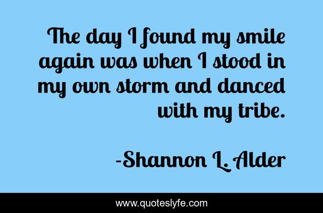 This page presents the quote "The day I found my smile again was when I stood in my own storm and danced with my tribe.". Author of this quote is Shannon L. Alder. This quote is about followers, support, thank-you, friends,.