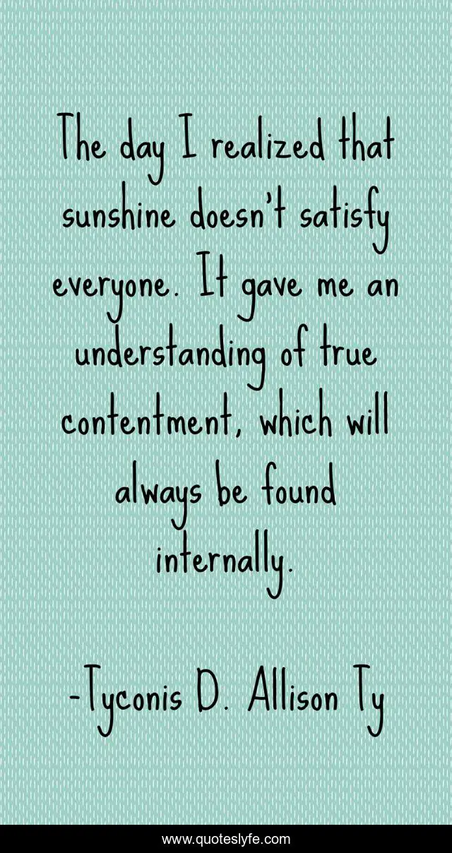 This page presents the quote "The day I realized that sunshine doesn't satisfy everyone. It gave me an understanding of true contentment, which will always be found internally.". Author of this quote is Tyconis D. Allison Ty. This quote is about life, sunshine, positive, motivational, confidence, optimistic, inspirational, enthusiasm,.