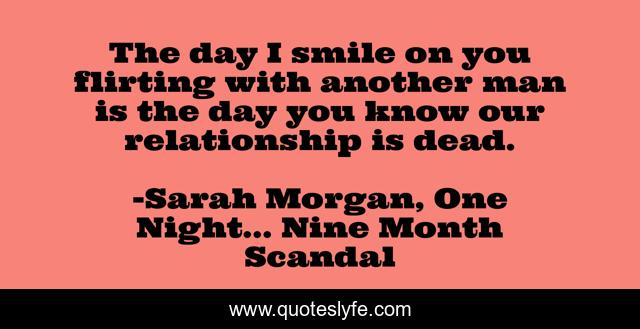 This page presents the quote "The day I smile on you flirting with another man is the day you know our relationship is dead.". Author of this quote is Sarah Morgan, One Night... Nine Month Scandal. .