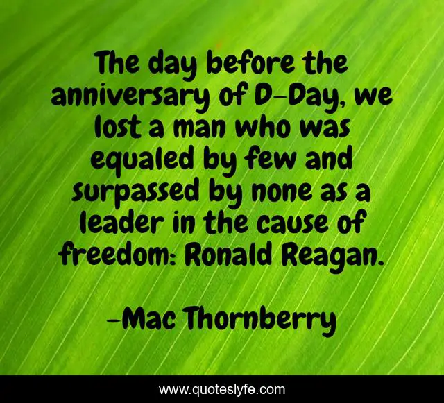 This page presents the quote "The day before the anniversary of D-Day, we lost a man who was equaled by few and surpassed by none as a leader in the cause of freedom: Ronald Reagan.". Author of this quote is Mac Thornberry. This quote is about freedom, day, leader,.