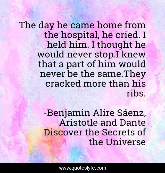 This page presents the quote "The day he came home from the hospital, he cried. I held him. I thought he would never stop.I knew that a part of him would never be the same.They cracked more than his ribs.". Author of this quote is Benjamin Alire Sáenz, Aristotle and Dante Discover the Secrets of the Universe. This quote is about quotes, life, suffering, recovering,.