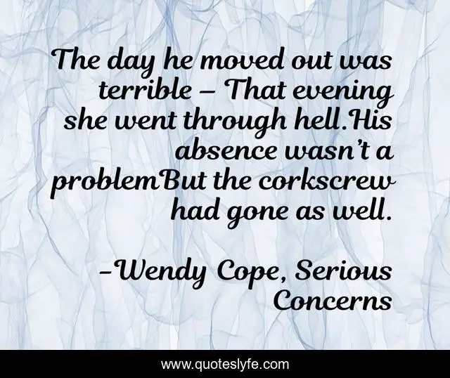 This page presents the quote "The day he moved out was terrible – That evening she went through hell.His absence wasn’t a problemBut the corkscrew had gone as well.". Author of this quote is Wendy Cope, Serious Concerns. This quote is about relationships, love, separation, affection,.