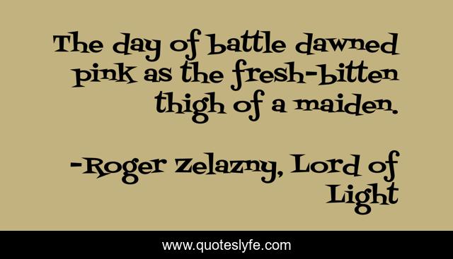This page presents the quote "The day of battle dawned pink as the fresh-bitten thigh of a maiden.". Author of this quote is Roger Zelazny, Lord of Light. This quote is about battle, dawn, sf,.