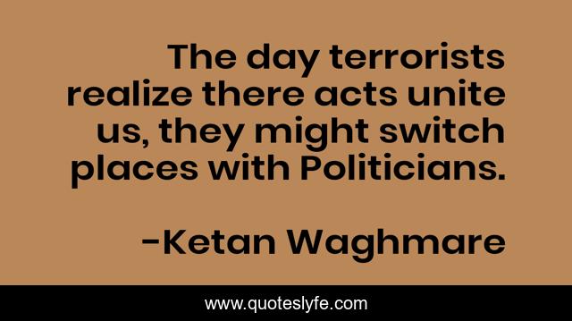 This page presents the quote "The day terrorists realize there acts unite us, they might switch places with Politicians.". Author of this quote is Ketan Waghmare. This quote is about irony, politicians, terrorists,.