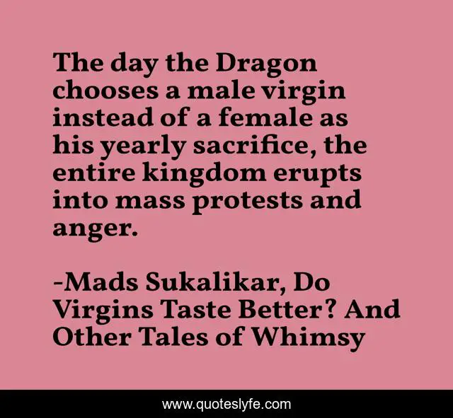 This page presents the quote "The day the Dragon chooses a male virgin instead of a female as his yearly sacrifice, the entire kingdom erupts into mass protests and anger.". Author of this quote is Mads Sukalikar, Do Virgins Taste Better? And Other Tales of Whimsy. This quote is about humorous, fantasy, humor, dragons,.