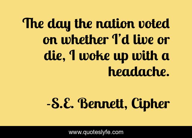 This page presents the quote "The day the nation voted on whether I’d live or die, I woke up with a headache.". Author of this quote is S.E. Bennett, Cipher. This quote is about s-e-bennett, cipher, young-adult, dystopian, science-fiction,.