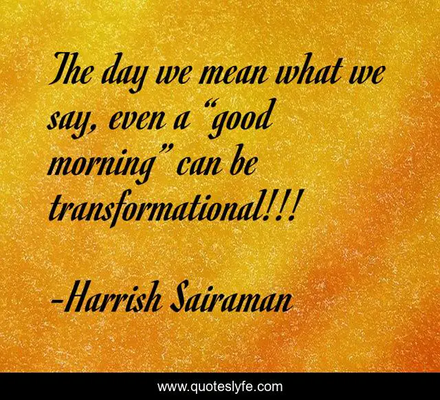 This page presents the quote "The day we mean what we say, even a “good morning” can be transformational!!!". Author of this quote is Harrish Sairaman. This quote is about good-morning, transformational, transformation,.