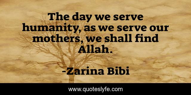 This page presents the quote "The day we serve humanity, as we serve our mothers, we shall find Allah.". Author of this quote is Zarina Bibi. This quote is about kindness, peace-on-earth, humanity-humans,.