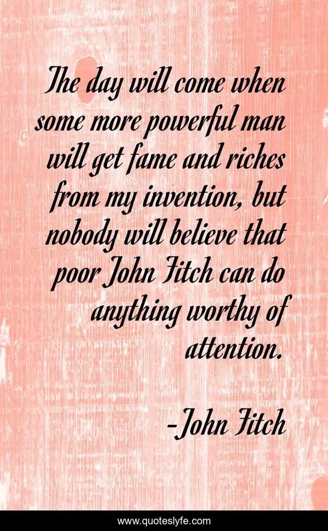 This page presents the quote "The day will come when some more powerful man will get fame and riches from my invention, but nobody will believe that poor John Fitch can do anything worthy of attention.". Author of this quote is John Fitch. This quote is about plagiarism, credit, attention, riches, fame,.