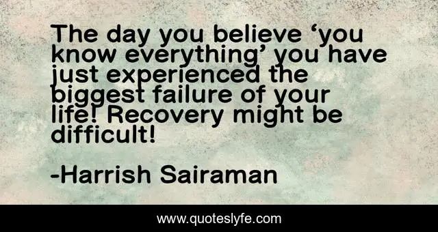This page presents the quote "The day you believe ‘you know everything’ you have just experienced the biggest failure of your life! Recovery might be difficult!". Author of this quote is Harrish Sairaman. This quote is about failure, believe, day, experienced, recovery,.