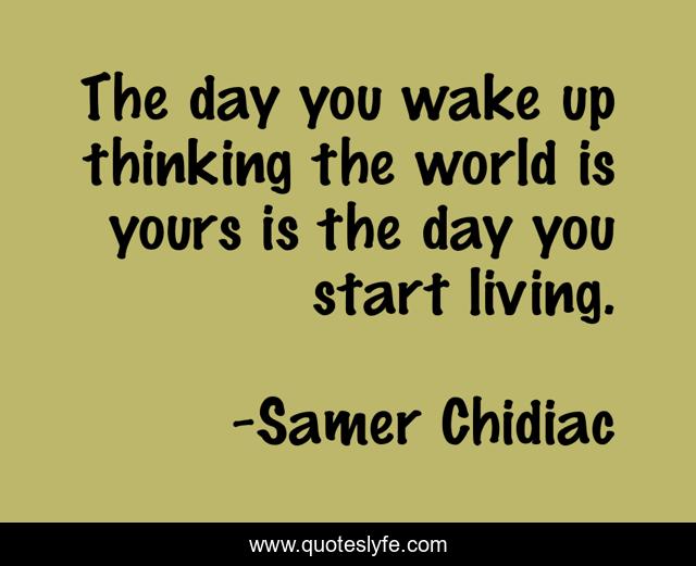 This page presents the quote "The day you wake up thinking the world is yours is the day you start living.". Author of this quote is Samer Chidiac. This quote is about life, positive, motivational, motivation, entrepreneurship, leadership, optimistic, inspirational, enthusiasm,.
