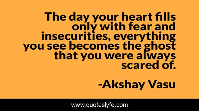 This page presents the quote "The day your heart fills only with fear and insecurities, everything you see becomes the ghost that you were always scared of.". Author of this quote is Akshay Vasu. This quote is about ghost, heart, pain, insecurity, day, become, fear, scare, fill,.