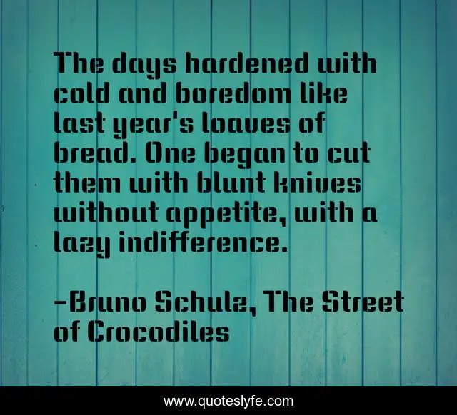 This page presents the quote "The days hardened with cold and boredom like last year's loaves of bread. One began to cut them with blunt knives without appetite, with a lazy indifference.". Author of this quote is Bruno Schulz, The Street of Crocodiles. This quote is about indifference, boredom,.