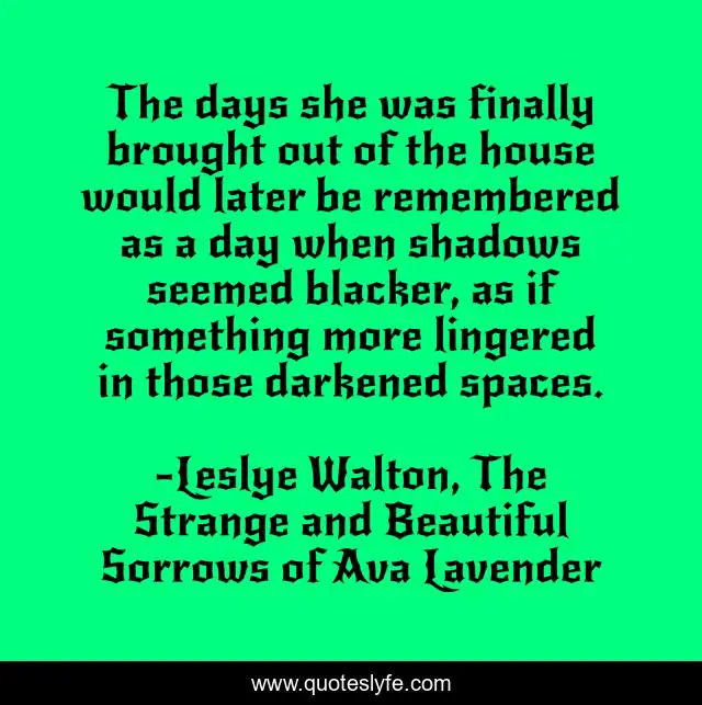 This page presents the quote "The days she was finally brought out of the house would later be remembered as a day when shadows seemed blacker, as if something more lingered in those darkened spaces.". Author of this quote is Leslye Walton, The Strange and Beautiful Sorrows of Ava Lavender. .