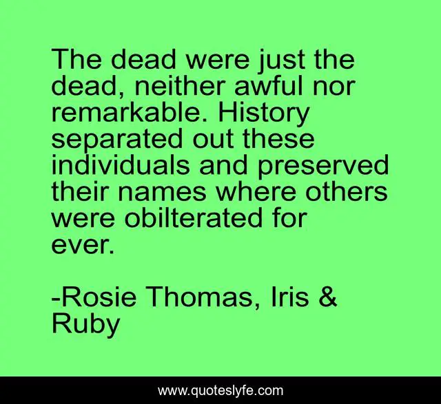 This page presents the quote "The dead were just the dead, neither awful nor remarkable. History separated out these individuals and preserved their names where others were obilterated for ever.". Author of this quote is Rosie Thomas, Iris & Ruby. .