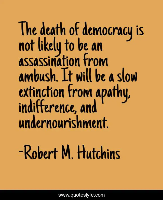 This page presents the quote "The death of democracy is not likely to be an assassination from ambush. It will be a slow extinction from apathy, indifference, and undernourishment.". Author of this quote is Robert M. Hutchins. This quote is about slow, democracy, apathy,.