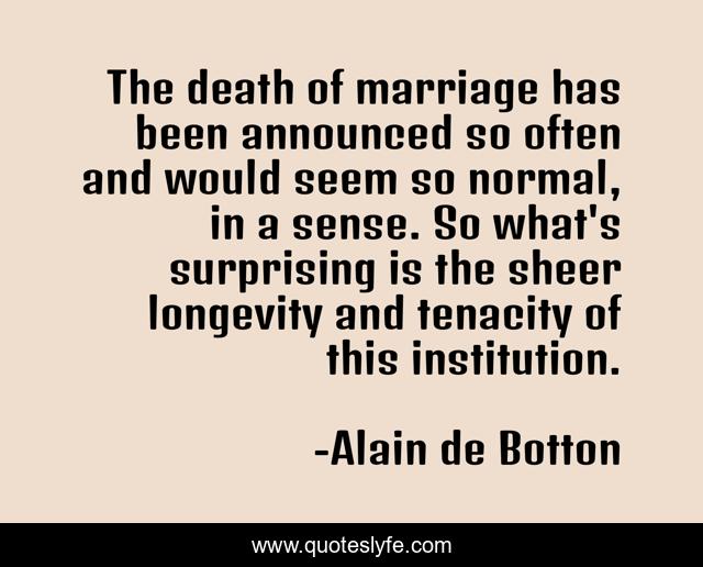 This page presents the quote "The death of marriage has been announced so often and would seem so normal, in a sense. So what's surprising is the sheer longevity and tenacity of this institution.". Author of this quote is Alain de Botton. This quote is about longevity, death, sense,.