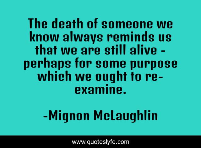 This page presents the quote "The death of someone we know always reminds us that we are still alive - perhaps for some purpose which we ought to re-examine.". Author of this quote is Mignon McLaughlin. This quote is about death, purpose, inspirational-living,.