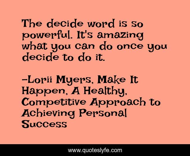 This page presents the quote "The decide word is so powerful. It's amazing what you can do once you decide to do it.". Author of this quote is Lorii Myers, Make It Happen, A Healthy, Competitive Approach to Achieving Personal Success. This quote is about success-self-improvement, strength, power, make-it-happen,.