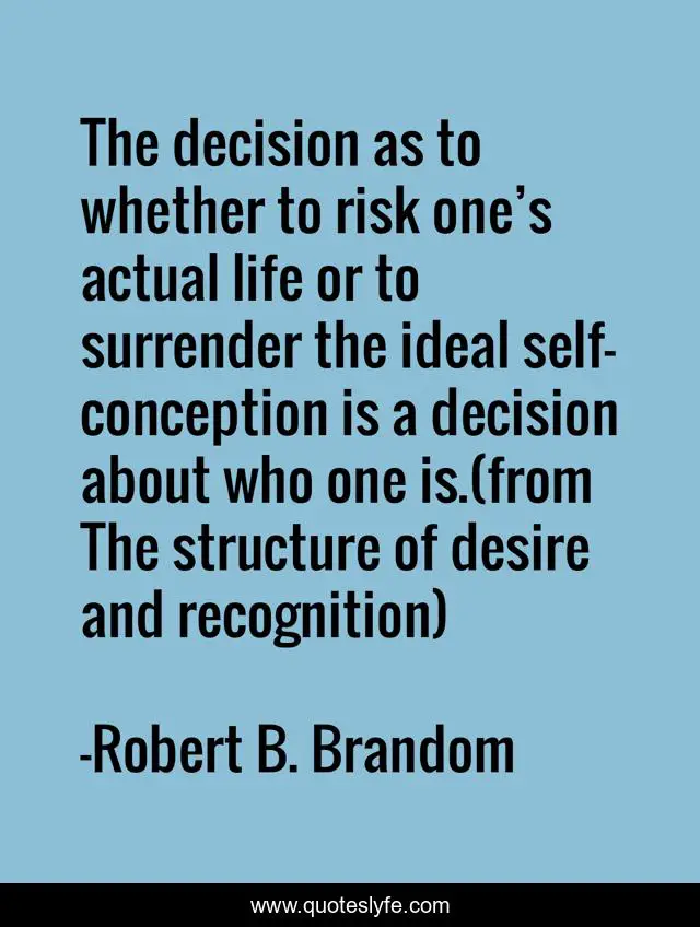 This page presents the quote "The decision as to whether to risk one’s actual life or to surrender the ideal self-conception is a decision about who one is.(from The structure of desire and recognition)". Author of this quote is Robert B. Brandom. This quote is about desire, idealism, self-conception, philosophy, recognition,.