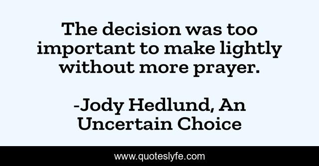 This page presents the quote "The decision was too important to make lightly without more prayer.". Author of this quote is Jody Hedlund, An Uncertain Choice. This quote is about decisions, prayer,.
