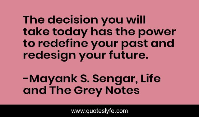 This page presents the quote "The decision you will take today has the power to redefine your past and redesign your future.". Author of this quote is Mayank S. Sengar, Life and The Grey Notes. This quote is about confidence, hard-work, success, positive, motivational, optimistic,.