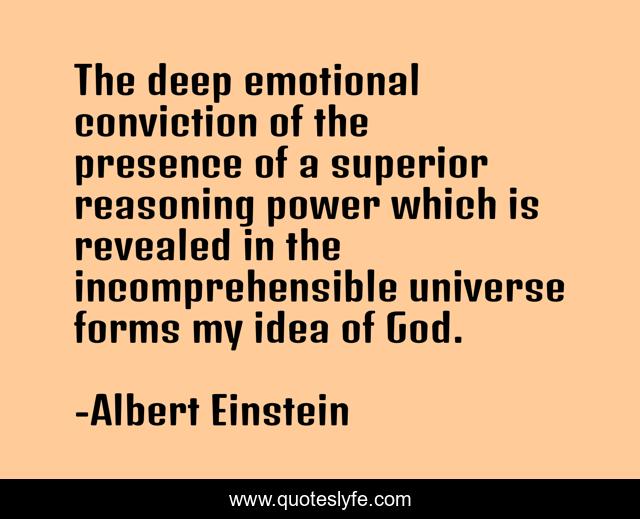 This page presents the quote "The deep emotional conviction of the presence of a superior reasoning power which is revealed in the incomprehensible universe forms my idea of God.". Author of this quote is Albert Einstein. .