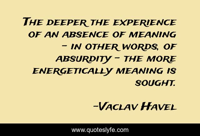 This page presents the quote "The deeper the experience of an absence of meaning - in other words, of absurdity - the more energetically meaning is sought.". Author of this quote is Vaclav Havel. This quote is about meaning, absence, words,.